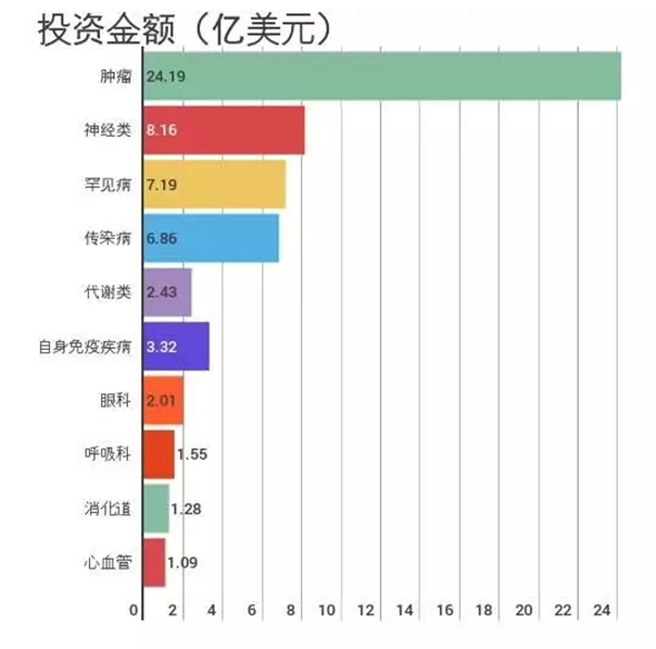 根据最新统计显示,肿瘤领域是最热门的疾病(Therapeutic Area)投资领域,在2015年到2016年上半年的时间内,在肿瘤诊疗领域共吸引了62个投资项目,吸金24.19亿美元. 肿瘤药开发除了在投资金额和项目数目上占绝对优势, 风险投资者支持的生物技术企业无论是通过并购,合作交易,还是上市退出渠道, 无论是交易数目还是交易的价值, 肿瘤药研发投入均为最多最高. 据统计,在过去18个月所作的交易, 大约三分之一是肿瘤诊断治疗产品的开发,总交易金额达到24亿美元.占生物科技投资总金额的36%. 这是从60多位业内顶级投资人所完成的交易中统计所得的数据. 业内人士认为,这种趋势和格局在未来几年,基本不会改变. 毫无疑问,肿瘤药开发长盛不衰,热度不减, 在过去十年,肿瘤药开发一直是最热门的投资领域.这不仅仅是因为肿瘤诊疗的临床需求远远没得到满足,市场与销售增长高于其他领域, 药厂在这个领域很愿意花重金自主研发,或通过外部合作与并购. 资本市场也比较看好这个领域的投资. 所以这个领域投资热度至今仍持续不减. 除了占绝对优势的肿瘤领域,其他投资者投资的领域和金额如下图所示: